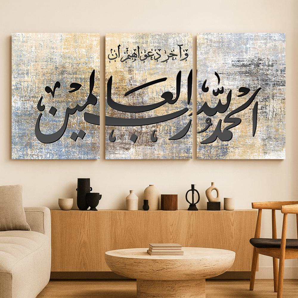 لوحة جدارية ثلاثية الأجزاء مصنوعة من خشب MDF بسماكة 6 ملم، مزينة بزخارف إسلامية أنيقة لعبارة "الحمدلله رب العالمين"، وألوان متناسقة من الذهبي والرمادي تمنح ديكور منزلك لمسة فنية راقية تجمع بين الأصالة والحداثة. اطلبها الآن من ماركتنا!