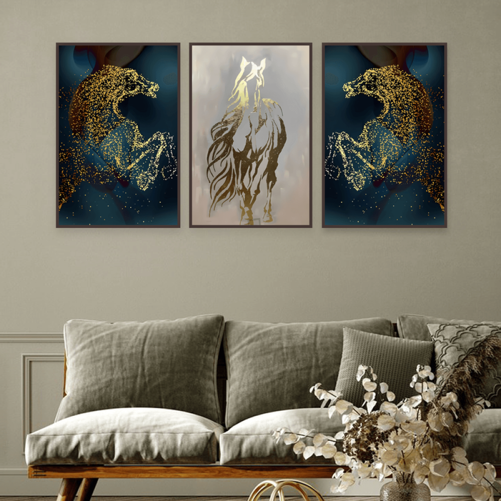 ثلاث لوحات قماشية بتصميم حصان مع برواز مجوف